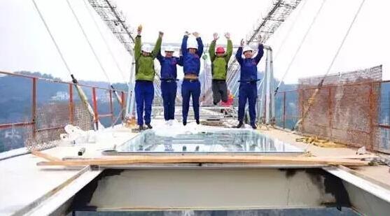 大橋所用97塊玻璃,每塊寬3。5米,長4。5米,面積約有15平方米,重量約有1。54噸。玻璃采用三層鋼化玻璃疊加的方式,每層玻璃之間使用透明膠片粘連。三層玻璃加上兩層夾膠,每塊玻璃的厚度約有5厘米,厚度是防彈玻璃的2倍。