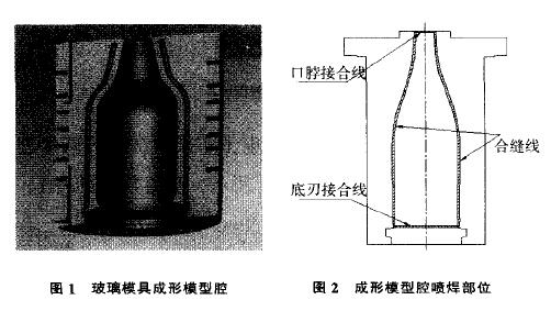 以啤酒瓶成形模型腔為例,如圖1所示。模具使用過程中模具合縫線、口脖接合線、底刃接合線(成模與底模接合線)因碰撞進行的維修占所有維修形式的80% 。雖然模具其他部分沒有損壞,接合線處的損壞也可導致模具過早失效。因此,在不改變玻璃模具整體性能的基礎上,對接合線等處進行模具局部區域等離子弧噴焊,起到強化保護玻璃模具表面的作用,噴焊部位如圖2所示。