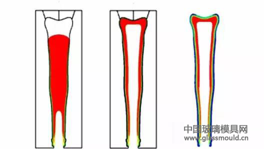 A. 正吹氣剛開始時在這個階段,正吹氣將料坯在成模內(nèi)吹漲。這個過程很重要,因為這個時候玻璃的流動性已經(jīng)不良,此時正吹氣壓力過大對料坯是一個很大的沖擊(CUT),玻璃瓶容易產(chǎn)生表面的褶皺以及瓶身厚薄不均甚至造成玻璃瓶抗沖擊的下降。所以這個階段應(yīng)該使用低氣壓(1.2bar),在時間分配上約為30%。見圖三左: