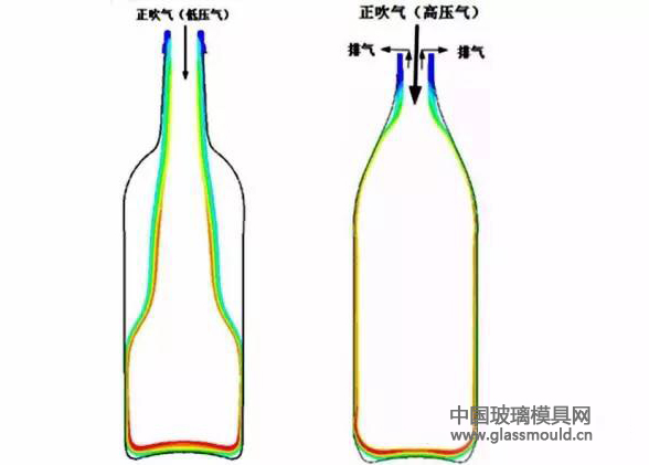 在成模中正吹氣,一般我們從正吹氣開始到結(jié)束均使用單一的氣壓。但是正吹氣剛開始時,如果氣壓過大則會對初模料坯沖擊太大,對料坯造成損傷(CUT),而在正吹氣后端時間里,如氣壓過低則會造成排熱效果不佳,熱玻璃瓶過軟從而產(chǎn)生各類缺陷及造成機速不能提高。因此正吹氣在優(yōu)化時必須要遵循此二點。