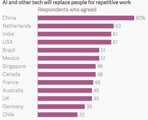和中國不同的是,德國的勞動者中只有少部分相信機器會壟斷反復作業。智利、新加坡、英國和法國也都是類似的看法。不過,美國和印度的勞動者則更傾向于中國的立場,近三分之二認為機器將占領重復作業。