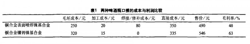 目前在玻璃模具復合材料的研究與開發方面,基本上是在模具基體材料上形成較薄的一層復合層,以提高模具內表面的熱性能、抗長大性能以及耐磨性等,通過一定的工藝方法形成層狀雙金屬復合材料。當然,不同的工藝方法,其制造成本和質量控制的效果也有所不同。如由于初型口模不僅受到強烈的熱沖擊,同時又受到成型時的壓力,因此初型口模要求具有良好的綜合性能。目前玻璃瓶工廠在生產中大量使用帶鎳芯的硅銅合金口模,國內通常采用的工藝方法為表面噴焊,而美國、意大利、臺灣等采用鑲鑄工藝生產這種口模。以啤酒瓶口模為例,對兩種口模的成本與利潤進行比較,見表l。