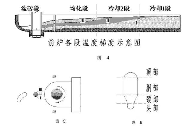 2.3.1.11 前爐溫度控制(雛形均溫性):由前爐各段溫度梯度示意圖來看玻璃液因靜壓及溫差等原因:前爐冷卻1段控制盆磚玻璃液下層溫度,冷卻2段控制盆磚玻璃液中層溫度,均化段控制盆磚玻璃液上層溫度。如要檢察雛形是否均溫,可從雛形是否正直來推斷,如雛形彎曲則均溫性差,制程缺陷也較多。