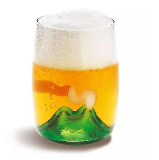 設計師倉田弘樹的作品夕陽酒杯,沒有倒酒之前,杯子好像是富士山,山頂還飄著白色云朵;而一旦倒入啤酒,便又會化為日落時金色的天空,如夢似幻。
