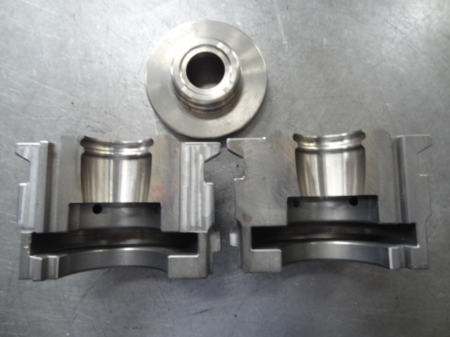 口模它是由二瓣口模與一個口環組成。口環裝在口模內,瓶口頂部的密封面是由此口環形成的,整個瓶口是由此口模形成的。同時口模它夾撐著初料坯從初模側翻轉到成模里。口環有時我們也稱為口板。