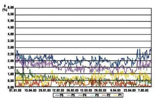 基于氧化鋯傳感器的Lambda控制系統(tǒng)是DeNOx技術(shù)中另外一個基本的、不可或缺的組成部分,其可以滿足任何窯爐或燃料類型的要求。Lambda控制系統(tǒng)的細(xì)節(jié)將是另一篇公開文獻(xiàn)的主題。圖10是橫焰窯熔池兩側(cè)每個小爐氧氣傳感器的典型安裝圖。SGT Lambda傳感器目前的使用壽命為3到8年,并且為優(yōu)化燃燒效率的自動化控制提供可靠的信號。在現(xiàn)有的窯爐上安裝SGT Lambda傳感器是已經(jīng)普遍實(shí)踐的,并且對于任何類型的窯爐均沒有問題,但是硼硅玻璃窯爐除外,由于化學(xué)腐蝕的原因,該種窯爐的傳感器探頭壽命會大大縮短。