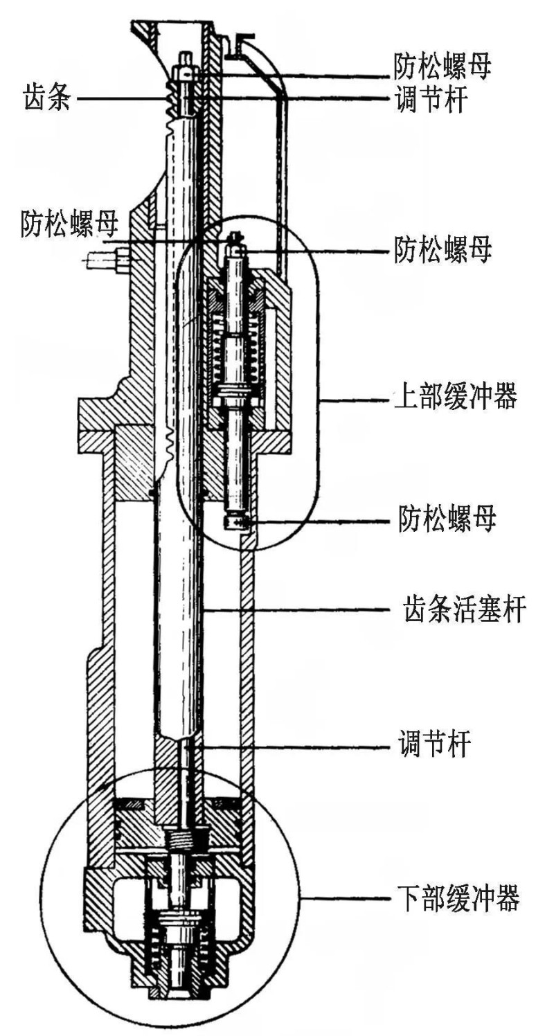 緩沖活塞在計量套中運動。該計量套用螺釘固定在確定的位置,其上部有一開孔和若干個節流孔。當齒條升起時,緩沖活塞在彈簧的作用下,移至并保持在它的上部靜止位置,油室用油充滿。