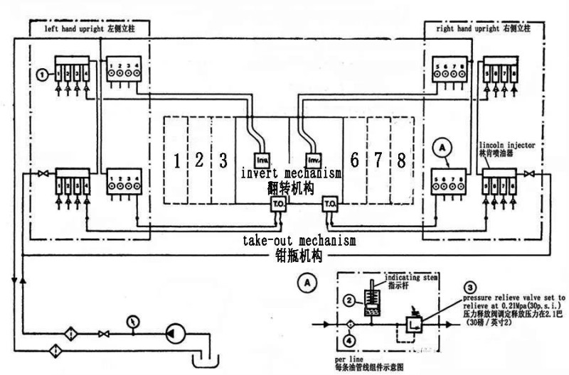 要確保在此系統中維持適當的壓力,即使是小的滲漏也不應發生。在每一機構的緩沖油返回管線上,裝有壓力儲油器②、壓力釋放閥③、過濾器④,每4條管線上的這些組件分別裝在左立柱或右立柱上的一塊共用聯接塊上。儲油器的活塞帶有一個指示桿,供目測檢查運行情況之用。通過檢查指示桿在兩個潤滑循環之間的動作情況,便能發現過大的滲漏。依此在影響到機構的正常功能之前,可及時安排計劃進行修理。