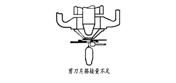 2、剪刀片搭接量不足,使剪刀片重疊合攏不夠,在剪切玻璃液時會使料滴未完全剪斷。在料碗口流出的懸掛玻璃液和剪切的玻璃料滴之間形成玻璃拉絲,這種玻璃拉絲可能會使玻璃料滴上下兩端產生微小的玻璃凸起。這種玻璃凸起的溫度會快速下降,形成玻璃碎片附著在玻璃料滴的表面,通過成型吹制過程中形成“剪刀印”。