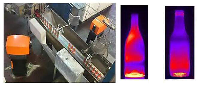 荷蘭Xpar公司的料重自動控制系統是Individual gob weight control(簡稱IGC系統),它的測量數據來源于該公司的IR-D系統,即IGC必須與IR-D系統一起配套使用。IRD系統是在機前輸瓶機的剔瓶功位前安裝兩臺熱成像儀,進行實時檢測,并形成每一個產品的熱像圖(圖5)。